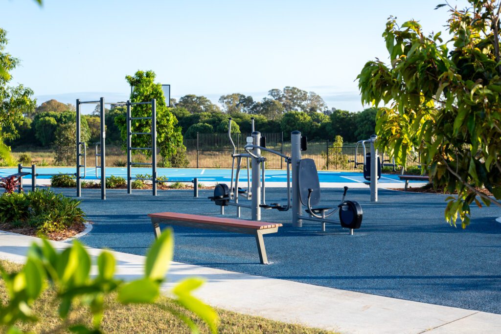 A huge array of fun playground equipment has been installed in the park, including a massive ocean themed tower with slides, a huge climbing net, multiple swings, rockers and spinners. A pump track for bike and scooter riders adds to the fun-filled area. The park also features extensive pathways for walking and cycling, fitness equipment, hopscotch, a basketball half-court and a sporting field with rugby/soccer combo goals.